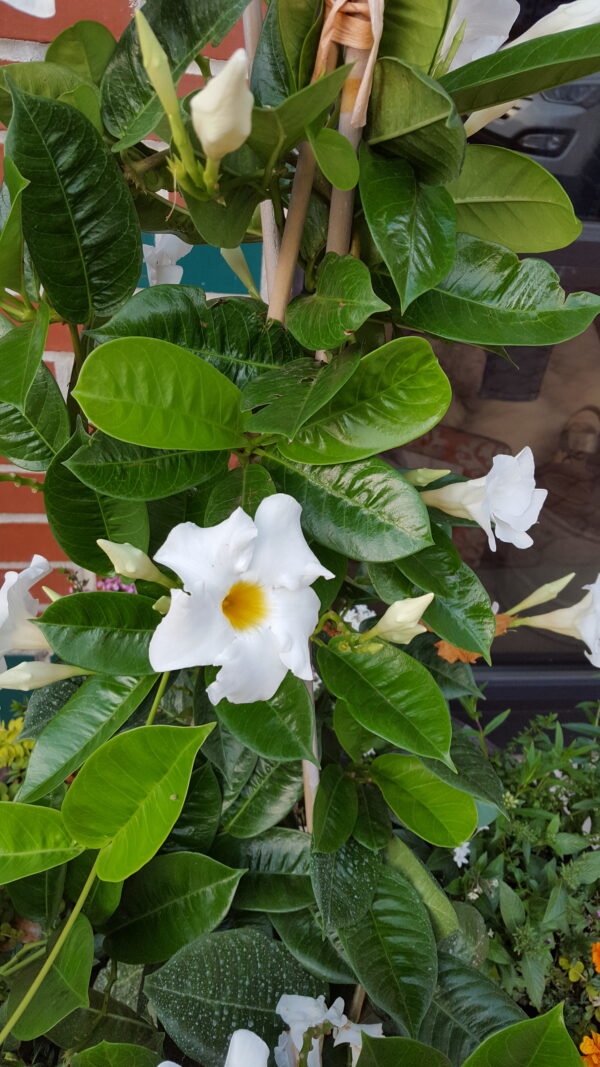 Η διπλαδένια είναι ένα αειθαλές αναρριχητικό φυτό, με προέλευση από τη Λατινική Αμερική. Καλλιεργείται σαν διακοσμητικό, για το όμορφο γυαλιστερό της φύλλωμα με σκουροπράσινους τόνους και τα κομψά λευκά λουλούδια της που ξεχωρίζουν στο πράσινο φόντο. Ταιριάζει υπέροχα σε κήπους και βεράντες, όπου συνδυάζεται πετυχημένα με άλλα ανθισμένα φυτά ή ακόμη καλύτερα με διαφορετικές αποχρώσεις του ίδιου φυτού και ανθίζει σταθερά από τα τέλη του καλοκαιριού ως το φθινόπωρο.